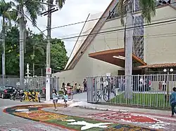Until the 1990s, the route of the Corpus Christi carpet began in the Parish Church, went to Pedro Nolasco Street and returned to the temple. After the conclusion of the new temple, the route was transferred to the streets of the Santa Helena and Professores neighborhoods.[18][17] The pipe organ located inside the cathedral[19] and the Corpus Christi procession are considered cultural heritage of Coronel Fabriciano.[20]