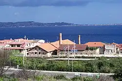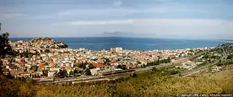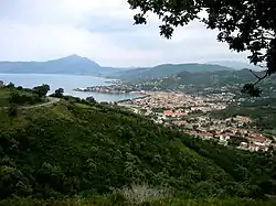Panoramic view of Sapri; the railway track is visible on the side of the hill; it reaches the station in the background on the right after a wide curve