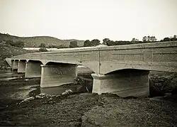 Salmon Falls, California was an old mining town established along the banks of the American River at the mouth of Sweetwater Creek (northeast of present-day Folsom, California). Since the construction of Folsom Dam in the 1950s (which created Folsom Lake) Salmon Falls is typically immersed in water throughout much of the year. However, at low-water levels old foundations, roads, and the old Salmon Falls Bridge are easily accessible.