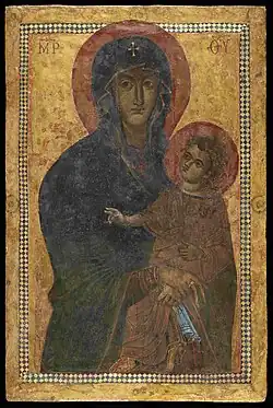 The image is five feet high by three and a quarter feet wide (117 × 79 cm) – very large for an icon, especially one with an early date. It is painted on a thick cedar panel. Mary wears a gold-trimmed, dark blue mantle over a purple/red tunic. The letters in Greek at the top identify Mary as "Mother of God" (Μήτηρ Θεοῦ in lower case and ΜHΤHΡ ΘΕΟΥ in upper case), as is usual in Byzantine art (Christ may originally have had an inscription under later re-painting). Christ is holding a book in his left hand, presumably a Gospel Book. His right hand is raised in a blessing,[13] and it is Mary not he who looks directly out at the viewer. The folded together position of Mary's hands distinguishes this image as a version of the earlier type from before the development of the iconography of the Hodegetria image in the 10th century, where she points to Christ with her right hand.[15] "Rather than offering the Child, she keeps his body closer to hers and seeks physical and tactile contact with him."[15] However the few other examples of this type do not have the Virgin's hands folded together – the right hand holds Christ's knee.