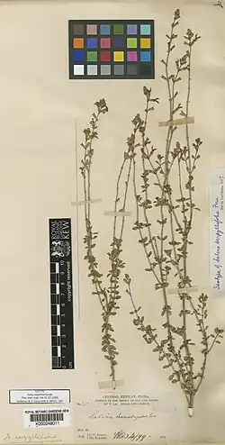 Salvia serpyllifolia is a woody perennial endemic to a small area in the Mexican state of San Luis Potosi. It was described by Merritt Lyndon Fernald in 1900, who gave it the epithet serpyllifolia because of its small, shiny leaves—similar to the leaves of Thymus serpyllum. Salvia serpyllifolia was introduced into horticulture in 1990 from seed collected at 7,000 feet elevation. At that time it was thought to be a variety of Salvia microphylla.[1]