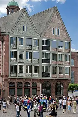 The Salzhaus was originally built around 1600. It had a rich carved façade on the gable side, making it not only the most important artisan-produced civil building in the city, but also one of the greatest achievements of the Renaissance in the German-speaking world. This building was largely destroyed in World War Two by aerial bombing in March 1944. The base of the old building was preserved, but the floors above it were rebuilt in 1951/52 in a simple post-war architectural form. The reconstruction of the historic facade is still under discussion; it was considered in the 1980s along with a row of houses on the other side of the square (the Ostzeile) but was not carried out. Since then, the organisation Friends of Frankfurt have continued this discussion.[1]