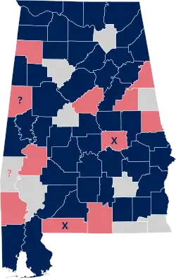 - Autauga, Baldwin, Barbour, Blount, Bullock, Butler, Calhoun, Cherokee, Chilton, Coffee, Colbert, Conecuh, Coosa, Crenshaw, Cullman, Dale, Dallas, DeKalb, Etowah, Fayette, Franklin, Greene, Hale, Henry, Jackson, Jefferson, Lamar, Lauderdale, Lawrence, Lee, Limestone, Lowndes, Macon, Madison, Mobile, Monroe, Montgomery, Morgan, Perry, Russell, St. Clair, Sumter, Talladega, Tallapoosa,[97] Tuscaloosa, Wilcox, Winston