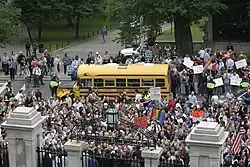 Other cities and towns in Massachusetts began issuing applications during normal business hours. Boston Mayor Thomas Menino greeted three of the couples who were plaintiffs in Goodridge and said: "We've broken down the barrier. I am so proud of these people. I am very proud to be mayor of this city today."[91] The first to marry in Boston City Hall were Tom Weikle and Joe Rogers, who lined up for their license application at 5:30 a.m. and were wed about 11 a.m. by Boston's city clerk.[87] Rejecting the Romney's insistence that the 1913 statute be respected, Somerville Mayor Joseph Curtatone addressed a crowd of same-sex couples that included several from New York gathered in front of Town Hall at 8 am.: "No matter who you are or where you come from, if you fill out the application, you will be given a license to marry. Those of you from out of state, welcome to Somerville."[87] The seven couples who were party to the Goodridge lawsuit were all wed on May 17,[92] beginning with Robert Compton and David Wilson at Boston's Arlington Street Church.[91] There were sizable celebrations in Northampton, Worcester, and Provincetown, while "explicit protests were scattered and few".[93]