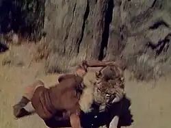 For an early scene with Hedy Lamarr, DeMille originally wanted Mature to fight the lion barehanded in the full shot, but Mature refused and a stunt man performed the scene. Mature appears in the close-ups. After the film's premiere, DeMille revealed that Mature's double "got a dreadful clawing down his arm which necessitated painting the wound on Victor's arm."[66] "Vic was leary about tangling with the critter," Lamarr confided to Hedda Hopper in December 1948. "I told him, 'Don't be afraid. I'm not, and I'm even wearing a red dress.' He replied, 'You've got your animals mixed. This is a lion, not a bull.' When he started closing in on the lion, the cameraman shouted, 'If he jumps, Vic, try and stay in the lights.'"[67] Mature himself later recounted the moment: