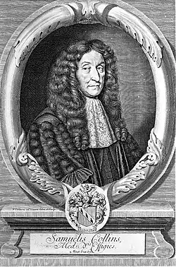 Samuel Collins, baptised in 1618,[1] was the only son of John Collins, rector of Rotherfield, Sussex, who was descended from an ancient family settled in the counties of Somerset and Devon. He received his education at Trinity College, Cambridge, where he was elected to a scholarship, and afterwards to a fellowship. He graduated BA in 1638–9, and MA in 1642. Then he travelled on the continent, and visited many universities in France, Italy, and the Low Countries, but found none to compare with the English. He was created MD at Padua on 25 August 1654, and was incorporated in that degree at Oxford in 1652, and at Cambridge in 1673.[2]
