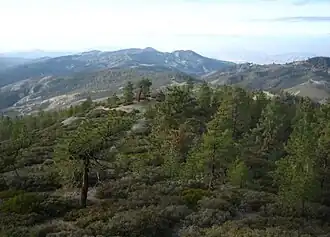 The mountain, which rises to an elevation of 5,267 feet (1,605 m), is the highest point in San Benito County and the Diablo Range.[2] The mountain gets some snowfall during winter.[4] The rock is a chrysotile serpentine, a soft fibrous silicate material. Extreme shearing of the bedrock, combined with soil nutrient imbalances, has resulted in extensive areas of natural barrens completely devoid of vegetation. The serpentine soils harbor several rare, endemic plant species, including San Benito evening primrose (Camissonia benitensis), rayless layia (Layia discoidea), Guirado's goldenrod (Solidago guiradonis), and San Benito fritillary (Fritillaria viridea). A unique pine and incense cedar forest occurs at the highest elevations of the mountain and in 1980, the San Benito Mountain Research Natural Area was designated an Instant Wilderness Study Area.[5]
