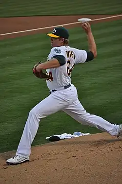 Former Torero A. J. Griffin, who was named a Freshman All-American in 2007 and a Second-Team All-American in 2008, shown pitching for the MLB's Oakland Athletics.[12]