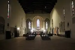 The church contains mostly fragmentary and restored frescoes inside; in 1911 many of the Baroque additions to the structure were removed. On the left wall, next to the side door, is a depiction of Saint Anthony (1426), facing the wall opposite a Crucifixion, both attributed to Antonio Alberti.