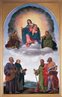 The San Domenico di Pesaro Altarpiece is an oil-on-panel painting created ca. 1524–1526 by the Italian Renaissance artist Giovanni Girolamo Savoldo, now in the Pinacoteca di Brera, in Milan. The work dates to the same period as Savoldo's Rest on the Flight into Egypt (Castelbarco Albani collection, Milan), also produced for San Domenico. It shows the Madonna and Child seated between two angel musicians, while in the lower register it shows (from left to right) Saint Peter, Saint Dominic, Saint Paul and Saint Jerome.[1]