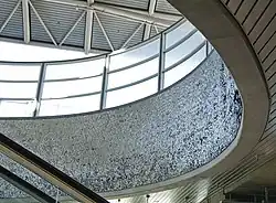 Wind Portal is a 2003 artwork by Sebastopol artist Ned Kahn on the surface of the cylindrical opening in the floor separating the BART station from AirTrain. Passengers transferring between the two rail services ride escalators or walk on stairs through the opening, which measures 10+1⁄3 feet (3.1 m) high with a 16-foot (4.9 m) radius. The artwork consists of 200,000 stainless steel disks, each 1 inch (25 mm) in diameter and individually hung so they respond to air currents induced by train traffic.[4][5] The work, along with others on the extension, was funded by a $1.5 million federal grant and other sources.[6] John King, urban art critic for the San Francisco Chronicle, praised it, saying it was "[m]esmerizing ... an ever-changing silver shimmer ... indefinable movements reacting to distant winds as well as the whoosh of trains. The experience is hard to predict; there's a sense of anticipation."[7]