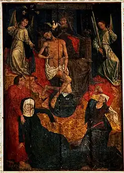A church at the site was originally erected in 1030 by Genovese mercenaries to celebrate the expulsion of the Saracens from Sicily.[1] That church was destroyed by the 1693 Sicily earthquake, and promptly rebuilt. The bell tower is unusual due to its merlionated roofline. The interior has ceiling frescoes depicting St George, by Bernardino Bongiovanni. The church has an altarpiece depicting the Trinity attributed to the Flemish painter Rogier van der Weyden or his pupil Vrancke van der Stockt. The canvas was donated to the church by the baronessa di Favarotta Donna Agata Interlandi.[2]