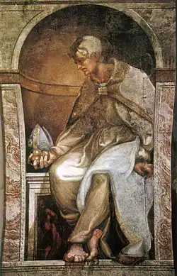 This is followed by the dome, with a fresco traditionally referred to as the Vision of St. John at Patmos,[1] and the drum and the four pendentives decoration. The third work was the decoration of the vault and the apse ceiling of the Cappella Maggiore, partially destroyed in 1586 when the choir was prolonged: today the central fragment with the Coronation of the Virgin (now at the Galleria nazionale di Parma) has survived. The fourth intervention was in the choir's walls, which were totally destroyed during its reconstruction. Preparatory drawings show that also the parts executed by his pupils were designed by Correggio, such as the candelabra in the presbytery's vault and the puttos on the cross-vaults.[3] Behind the 17th century altar in polychrome marble is a large canvas of the Transfiguration by Girolamo Mazzola Bedoli (c. 1556).[1]