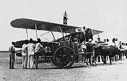 Airplane being fueled on San Jerónimo aviation field in 1928. This airport served the Baja Verapaz Department region.