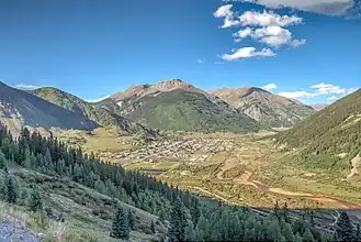 According to the U.S. Census Bureau, the county has a total area of 388 square miles (1,000 km2), of which 387 square miles (1,000 km2) is land and 0.8 square miles (2.1 km2) (0.2%) is water.[10] It is the fifth-smallest county in Colorado by area. The county is located in the heart of the San Juan Mountains of Colorado. Though it has the highest mean elevation of any county in the United States, at 11,240 feet (3,430 m), none of Colorado's 53 fourteeners (mountains at least 14,000 feet in elevation) are in San Juan County.[11]
