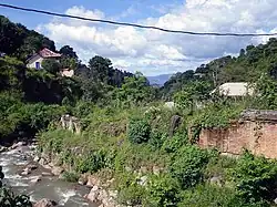 Because of its history as a mining town, San Juancito was not founded with thought being given to terrain. It is perched in the mountains on very uneven land, and therefore does not have the Spanish-inspired central layout that tends to be the style of rural Honduran communities. For this, San Juancito is really an agglomeration of four core barrios, and three outlying dependent hamlets. The four core barrios are known by residents as Barrio el Centro, Barrio Arriba, El Plan, and Carboneras, and are divided by rivers and precipices. Two rivers meet in Barrio El Centro, with two bridges traversing them. The three outlying dependent hamlets are known as Nuevo Rosario (the former headquarters of mining operations), Guacamaya, and Plan Grande. The first two are located along an old mining road about 350 meters (1150 feet) above San Juancito proper, each about 2.5 kilometers from the town center. Nuevo Rosario and Guacamayas are located at 1621 meters (5300 feet) and 1538 meters (5000 feet) above sea-level, respectively.