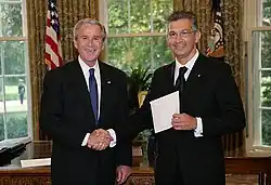 Paolo Rondelli, the first Ambassador of San Marino to the U.S., with President George W. Bush on July 16, 2007.