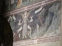 This church was commissioned by the monastic order of the Umiliati, who built this church between 1297 and 1345, next to a former convent. The dedication suggests an earlier Lombard church was present at the site. The rectangular building with a single nave has undergone a number of reconstructions. The interiors contain frescoes completed in 1368 by Biagio di Goro Ghezzi, depicting the Story of St Michael, the Annunciation, and the Nativity. In addition, there are allegorical depictions of the four evangelists and portraits of Saints. The style recalls the influence of Ambrogio Lorenzetti. The main altarpiece depicts an Enthroned Madonna and Saints by Guidoccio Cozzarelli. The altar has a wooden ciborium sculpted by Bartolomeo Neroni, also called “il Riccio”. The church houses a polychrome wooden crucifix.[1]