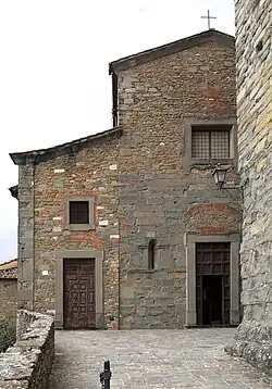 The present church still retains some Romanesque elements from an original church, likely the chapel or church located inside a former castle, and dedicated to St Michael Archangel, a saint favored by Lombards. When the parish responsibilities of the rural church of San Pietro in Neure were transposed inside the medieval walls of the town and into this church, the rededication occurred. A major refurbishment took place in the 18th century, when it was enlarged to have three aisles, under the designs of Antonio Zannoni. Some of the interior columns derive from the earlier Romanesque church.[1] Iin a survey of 1896, the interior of the church had altarpieces including a Concezione by Ranieri del Pace; a Resurrection and Saints by Santi di Tito; and two marble alatar by Marco Moretti. In the church museum is a Reliquary of Santa Barbara, attributed to Benvenuto Cellini or one of his followers.[2]