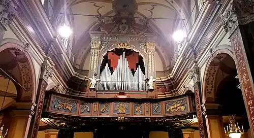 After being looted by the French, the church was rebuilt starting in 1741 and completed in 1744.[1][2] A tall stone bell tower was added in 1764. Originally, it had a wooden dome, but this was destroyed by a fire in 1834 and subsequently replaced with a masonry roof in 1848.[1]