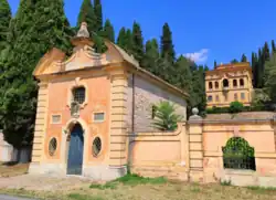 At the southern end of the middle terrace the nunnery stands on the site of the original villa Urbani, where a large mosaic pavement was found during construction of the villa in the 1600s with parts of a statue of Venus. An excavation in the building's foundations there in 2011[2] revealed an older temple had been built on the highest terrace. In the 2nd half of the 1st century BC the temple was extended with a new cella on the middle terrace below and a bi-coloured mosaic and new statue. This remodelling went together with a reconsecration of the old cult site to a new one of the imperial Caesarian cult of Venus Genetrix, central to Augustus's religious ideology at that time and entry into the religious heart of Umbria.[3] This remodelling was referred to in the inscription[4] found in the 1600s commemorating the commissioning of a statue to Venus by the duumvirs Marcus Granius and Sextus Lollius following a decree of the decurions of Hispellum. The extension of the old temple involved the construction of new walls and a new pronaos overlooking the valley, dated to ca. 27 BC, after Augustus had restored Via Flaminia.