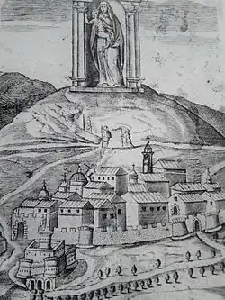 The Chapel of the Apparition situated along the via Crucis on Mount Salviano preserves the print that the Madonna's mule carved in the stone with a blow of his hoof before disappearing with the Virgin. The reconstruction of the church occurred in 1614 from the foundations and enlarging the religious building,[6][7] so much so that the cult of the Virgin of Pietraquaria became even more widespread.[8]