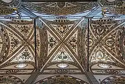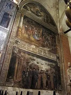 The extensive restoration of the complex, carried out between 1879 and 1881, also affected this chapel: the Baroque altar in the center of the chapel was removed, but the old large windows were reopened to allow light to enter the interior. The restoration also made it possible to rediscover some of the frescoes that decorated the side walls: those on the right were almost completely destroyed to allow the construction of the Lavagnoli funerary monument, while those on the left were preserved.[73] These are a cycle of frescoes intended to celebrate the power of the family, depicting episodes from the life of St. John the Evangelist, interspersed in the center of the left wall with a Crucifixion and a Blessing St. James and the Apotheosis of the Lavagnoli family. The latter are the work of a young Gian Maria Falconetto (who probably painted himself),[75] while the rest of the cycle is by an unknown author, although the clear Mantegnesque origin of the paintings has allowed attribution to Francesco Benaglio or Michele da Verona.[50]