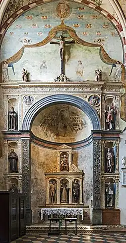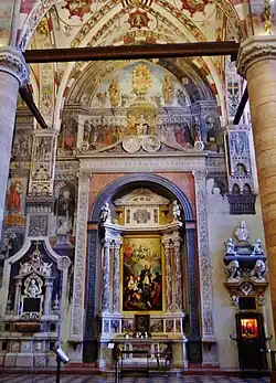 The presbytery is raised a few steps above the rest of the basilica and occupies the entire area of the high apse, preceded by a square bay covered by a cross vault; on the right wall is the Last Judgement, attributed to Turone di Maxio,[61] while on the left wall is the monument to Cortesia Serego, a condottiere in the time of the Scaligeri.[62] The high altar, dedicated to St. Peter the Martyr, is made of light yellow marble and was built and consecrated in 1952; previously it was made of a red stone that was later placed at the base of the modern altar. In the center of the altar is a simple marble tabernacle, placed on March 22, 1529, at the behest of Alessandro dal Monte, who paid for it;[63] above it is a large painted wooden crucifix.