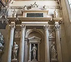 To the left of the presbytery is the monument to Cortesia Serego, an interesting work for its mixture of sculpture and painting. The cenotaph consists of a central core in which the figure of Cortesia on horseback, wearing armor and holding the staff of command, stands out.[65] Horse and rider are placed above the sarcophagus, which is divided into seven niches, five at the front and two at the sides, and the whole is set within a heavy stone curtain. Above the curtain are the coat of arms of the Serego family and the figure of the Archangel Gabriel.[66]