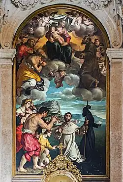 The walls are also decorated with other frescoes: The Virgin and Child, St. Christopher, and the most valuable one, the Miracle of St. Eligius of Noyon, all three attributed to Martino da Verona, a painter who died in 1412.[55][58] On the left is the fresco of the Baptism of Jesus, attributed to Jacopino di Francesco, a Bolognese painter of the first half of the 14th century, considered one of the fathers of Po Valley painting. The altar is adorned by an altarpiece painted by Liberale da Verona, in a richly carved and gilded frame.[57]