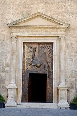The church has two portals: the main one overlooks piazza Ciullo, while the other one, with the statue of Saint Olivia on it, faces Corso 6 Aprile. Initially, there was a main portal dating back to 1572,[1] but after the acquisition of some funds in connection with the Great Jubilee, both doors were replaced by two golden bronze ones realized by Vincenzo Settipani, an architect. They were made to represent "Jesus while entering the Cenacle with closed doors" (on the main entrance) and "Jesus' entering Jerusalem" (on the side entrance).
