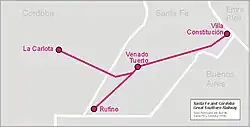 The line was extended to Venado Tuerto on 8 July 1890 and to La Carlota on 24 February 1891. A branch line from Venado Tuerto to Rufino was opened on 11 March 1899.[1]