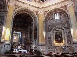 The presbytery includes a ceiling fresco (1626) depicting Samuel anointing David as King by Giulio Orlandini. Above the main altar is the fresco depicting the lactating Madonna painted by Mercurio Baiardi.[1]