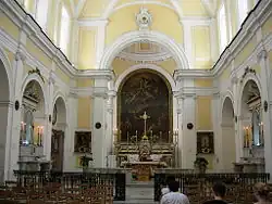 Both Simonelli and Malinconico were students of Luca Giordano. The main altarpiece is a canvas depicting the Ransom of Slaves (1672), by Giacomo Farelli, which depicts the Virgin with the child between whose arms above a group of slaves awaits redemption by the arrival of a boat. The main altar was restored by Sanfelice and Lorenzo Fontana. The putti there were sculpted by Domenico Antonio Vaccaro.