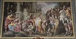 On the left, in a classical setting of ruins, is the Nativity with the Madonna holding the Child and, behind her, Joseph, the ox and the donkey. In the center of the fresco are the Three Kings in oriental dress in various poses. Surrounding the Magi is a group of people: behind them is a kind of procession that seems to continue along a mountain path. On the right are people on horses and grooms. According to tradition, one of these figures, the man with a moustache and goatee who looks directly at the viewer, is a self-portrait of Gian Giacomo Barbelli. The painting is signed.[21]