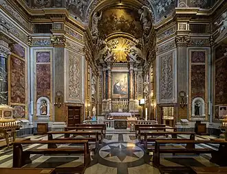 The interior is on a Greek cross plan, with Baroque decoration. Its dome fresco by Michelangelo Ricciolini depicts the Glory of Paradise. The church houses a gilded wooden organ. To the left of the entrance is a chapel in the form of the grotto at Our Lady of Lourdes, dedicated in 1912.