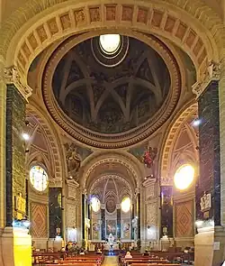 It was built in a Neo-Classical style, inspired by the Italian Renaissance, with a staircase in front of the façade, a travertine doorway, a single nave with side chapels, and a basilical baldachino. The church's dome is decorated with frescoes by Aronne del Vecchio, painted in 1961, of The Angels in Paradise with the Most Holy Trinity and the Blessed Virgin. (with pendants of The Evangelists) who also made an image of The Deposition for the entrance to the sacristy and of The Birth of the Saviour for the church's side entrance. The high altarpiece is a copy of Guercino's St Michael the Archangel from San Pietro in Vaticano.