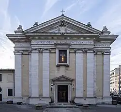 The present church, which now lies below street level, is the result of Pope Benedict XIV's 1751 reconstruction a bit northeast of the old church. The cube-shaped exterior is divided by pilaster strips in a Neoclassical style, but with a late-Baroque elements, including a dome influenced by the architecture of Borromini. The façade was designed by Girolamo Theodoli. An inscription that runs along the facade recalls the reconstruction carried out in 1751 by Pope Benedict XIV. The doorway has a simple triangular pediment.