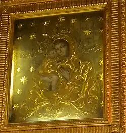 In 1718 an icon of Madonna and child is said to have been discovered under the plaster of a wall in the adjacent sacristy building and the next year it was removed and installed above the main altar of Sts. Sergius and Bacchus at the order of Pope Clement XI (1700–21). The icon is a copy of an icon venerated at a Marian shrine in Zyrowice, a town now in Belarus, known as Our Lady of Zyrowice or Our Lady of the Pasture. That icon is said to have miraculously descended from the heavens in 1480 in the sight of a group of shepherds pasturing their animals. Sts. Sergius and Bacchus in Rome has thereafter also been called Madonna del Pascolo (Madonna of the Pasture).[8][9]