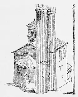 - a deaconry in the Roman Forum, established as one of the original seven cardinal deaconries of Rome in 678 by Pope Agatho (678–681). This church, founded on its own ground in the Forum and not on the foundation of another building, was situated just under the Capitoline Hill between the Temple of Concord and the Temple of Vespasian and Titus. The Temple of Concord in the Roman Forum had served the church as a diaconia until it began to collapse by 790 AD. Pope Adrian I (772–95) rebuilt it after the collapse of the Temple of Concord (LP 97.90). Pope Paul III (1534–49) began demolishing it about 1536 and the church was suppressed as a cardinal deaconry, vacant from 1559, in 1587 by Pope Sixtus V (1585–1590). Demolition was mostly completed during the term of Pope Paul V (1605–1621), though parts of the apse remained until 1812.[2][3]