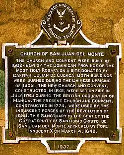 Santuario del Santo Cristo Parish, also known as the Church of San Juan del Monte, is a church and convento in San Juan, Metro Manila, Philippines. It is under the jurisdiction of the Archdiocese of Manila. The church was built in 1602–1604 by the Dominicans on land that was donated to the order. Both the church and convento were burnt and destroyed during the Chinese insurrection of 1639, and later rebuilt in 1641. It was again destroyed in July 1763 as Britain briefly occupied Manila during the Seven Years' War. The current church and convento were built in 1774, and used as a shelter by Katipuneros during the 1898 Philippine Revolution against the Spanish Empire. It has since been renovated many times until the 1990s.