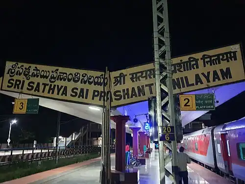 Sri Sathya Sai Prasanthi Nilayam (station code: SSPN) is a major railway station and is located around 8 km to the west of the pilgrim town of Puttaparthi in Andhra Pradesh, India. Puttaparthi is a renowned pilgrim center and the location of the ashram of Sathya Sai Baba. The station falls under the jurisdiction of Bangalore division of South Western Railways.[1] It has four platforms and is situated on the line connecting Dharmavaram and Penukonda.