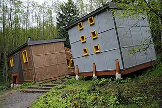 Slate cabin and main room of the Saturna Ecological Education Centre.