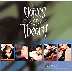 "Say It" is a song performed by American contemporary R&B group Voices of Theory, issued as the second single from their eponymous studio album. The song was their biggest hit on the Billboard Hot 100, peaking at #10 on the chart in 1998.[5]