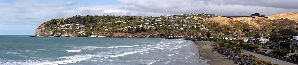 Scarborough is located between Sumner and Te Onepoto / Taylors Mistake.[3] It was named for the seaside resort in North Yorkshire, England.[4] The first European owner of most of the land was Major Alfred Hornbrook,[5] whose Mount Pleasant run stretched as far east as Godley Head. A small land parcel of 25 acres (10 ha) near present-day Nicholson Park belonged to Charles Church Haslewood, who died in May 1858 when his hunting gun discharged while he looked down the barrel.[3]