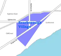 Scarborough Village is a neighbourhood in Toronto, Ontario, Canada, located in the larger namesake Scarborough district. It was one of the earliest settlements in the former township of Scarborough with the distinction of being the site of the township's first post office. Despite this, it was not the town centre from where the later (and now defunct) City of Scarborough grew, with mass urbanization of the former municipality actually having begun as spillover growth from the old City of Toronto at Birch Cliff in the district's southwestern extremity. Today, the neighbourhood is composed of private and public housing, apartment complexes, schools, a few condominiums, and strip mall plazas. The neighbourhood lies along the Scarborough Bluffs escarpment.