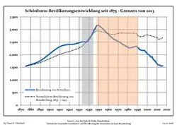 Development of Population since 1875 within the Current Boundaries (Blue Line: Population; Dotted Line: Comparison to Population Development of Brandenburg state; Grey Background: Time of Nazi rule; Red Background: Time of Communist rule)