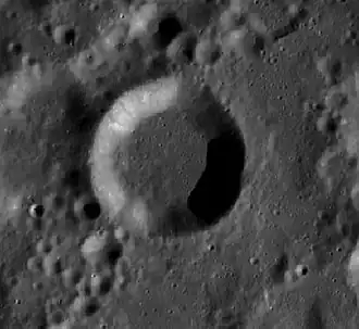 Schönfeld is a lunar impact crater that is located just beyond the northwestern limb of the Moon, on the far side from the Earth. This part of the surface can sometimes be brought into view during periods of favorable libration and illumination, although not much detail can be discerned. This crater is located to the north of Avicenna and the huge walled plain Lorentz. To the northwest lies the crater Rynin and to the northeast is McLaughlin.