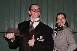Schave & Reilly are a modern-day version of Vaudeville’s “baggypants comedians" who perform physical comedy.[1] The duo is the husband and wife team of Ben Schave and Caitlin Reilly who have worked together over ten years.[2] The pair collaborate to create original material, using the themes of love, relationship, sports, and the workplace to develop their shows . Schave & Reilly are based in Austin, Texas.[1] Trained at the schools of the Dell'Arte International School of Physical Theatre and the University of Texas, the couple met while learning their physical comedy craft at the Ringling Bros. and Barnum & Bailey Circus Clown College.[2] Both performers were influenced by performers such as Charlie Chaplin and by Ray Bolger, the scarecrow from The Wizard of Oz. Bolger was a vaudevillian dance performer whose work in the movie was derived from his vaudeville act.” [3]