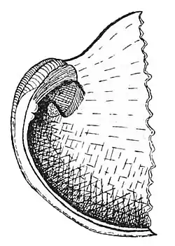 The radula is 12 mm long and 3 mm in width.[10] It has 61 rows of denticles (tiny teeth). There is sometimes a rudimentary tooth in the centre of some rows. The number of lateral teeth varying from 24 to 28. Charles Hedley[10] described radula formula with 26 teeth: 24 + 0 + 24 × 61 while Robert C. Murdoch[11] described radula formula with usual 26 teeth: 26 + 0 + 26 × 61. The innermost four teeth are small and slender, then they increase rapidly in size. The 25th tooth is rather smaller than the 24th, and the 26th is minute and occasionally absent.[7]